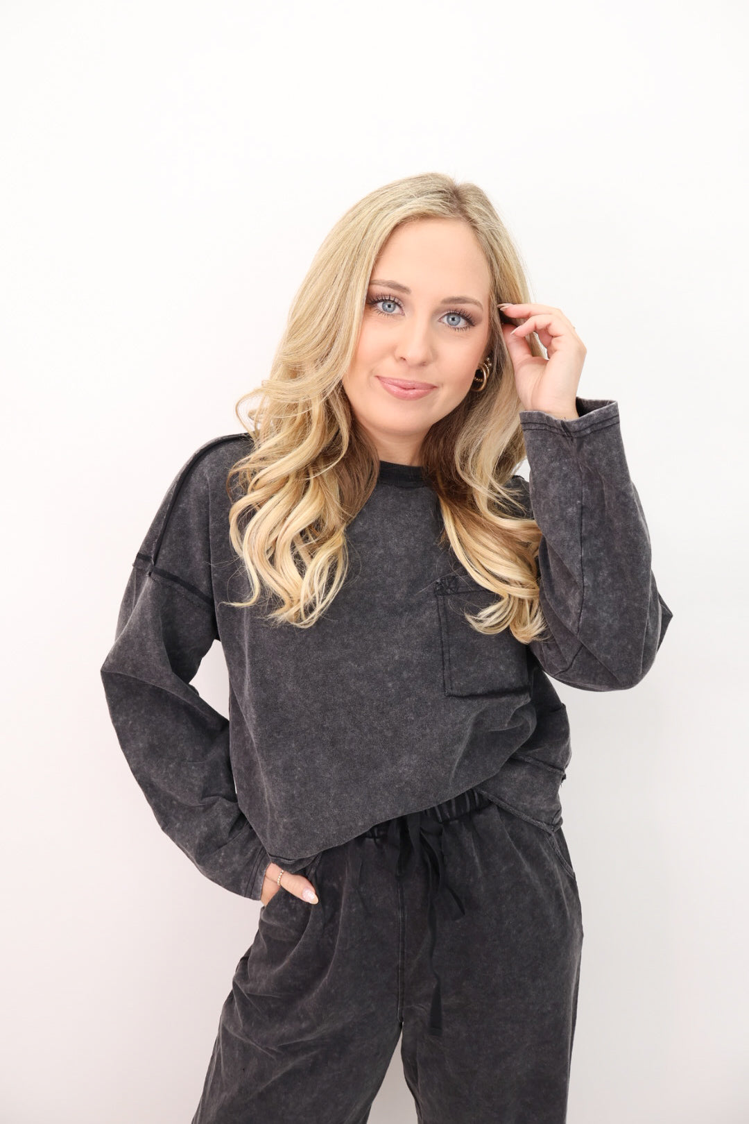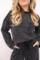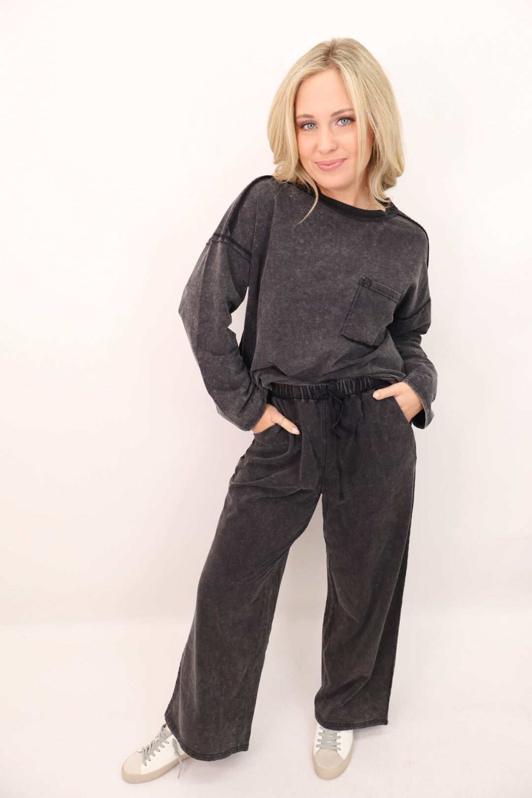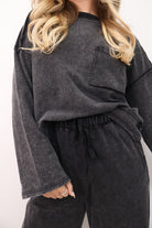 This mineral-wash set gives you that vintage, lived-in look with the softness of your favorite sweatshirt! The top features a relaxed fit with raw-edge detailing and a front pocket, while the matching pants have a stretchy waistband, side pockets, and a wide-leg silhouette that feels like heaven on. It’s the laid-back set you’ll want for movie nights, road trips, and everything in between.