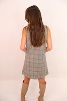 plaid mini dress, button front dress, fall plaid dress, sleeveless plaid dress, chic fall outfit, versatile plaid dress