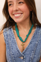 Teal Scarf Necklace with Hammered Cross Pendant