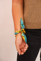 Modern, artistic, and bold — this cuff is like wearable art. With a brushed gold base wrapped in blue, teal, and gold fabric, it’s the perfect conversation-starting accessory.