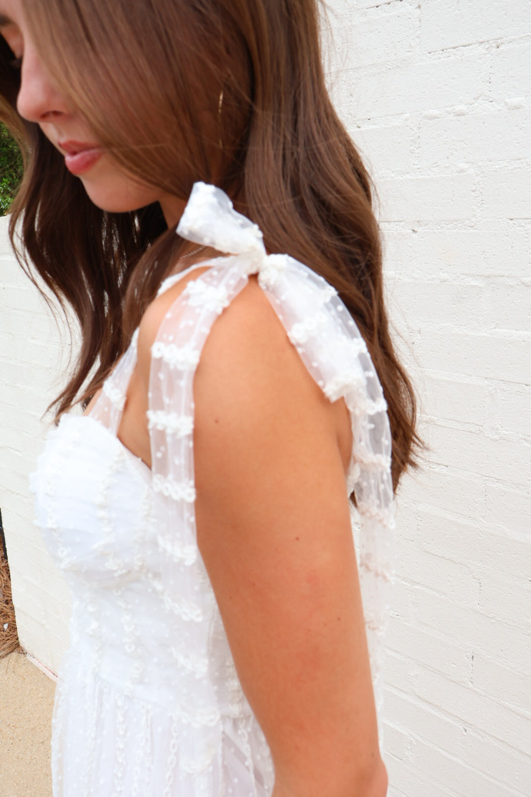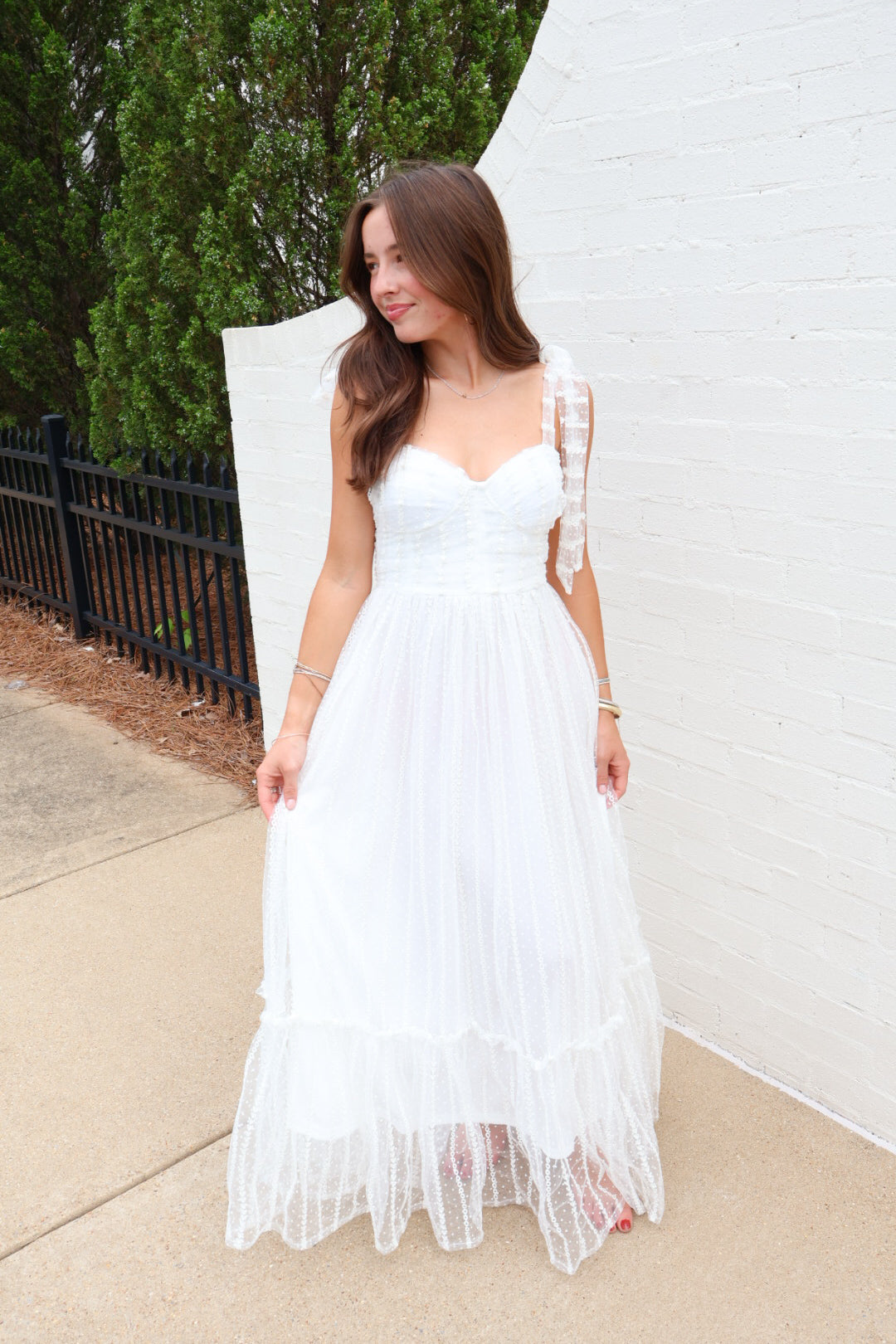 Ethereal and romantic, our Off-White Organza Lace Maxi Dress is the perfect choice for brides-to-be or anyone seeking an effortlessly elegant look. Designed with a fitted bust and padded molded cups for structured support, this dress flatters while offering comfort. The delicate organza lace fabric adds a soft, airy feel, while the adjustable shoulder ties provide a customizable fit. Whether you're celebrating a bridal shower, engagement photos, rehearsal dinner, or elopement, this dress is an unforgettable statement of timeless beauty.