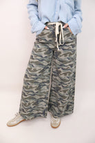 camo wide leg pants, women’s camouflage pants, lightweight camo trousers, casual drawstring pants, trendy camo loungewear, boutique camo pants