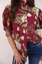 wine floral blouse, fall botanical top, puff sleeve floral blouse, burgundy button down top