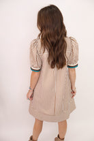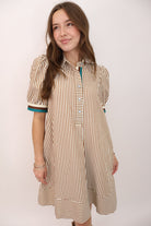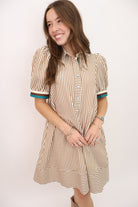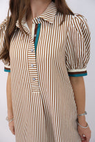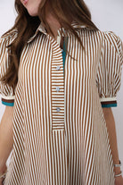 Brown & Cream Striped Puff Sleeve Dress