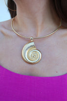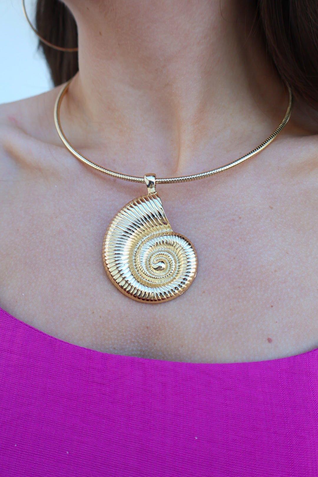 gold shell necklace, coastal jewelry, beach vacation accessories, statement pendant necklace, resort jewelry, summer accessories