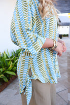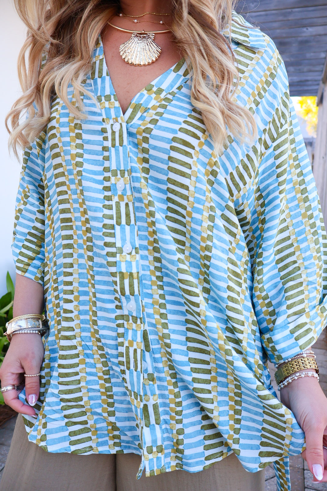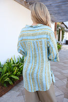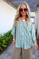 resort wear top, printed tunic top, lightweight beach blouse, coastal style top, vacation outfit ideas, flowy summer top, breezy button front blouse