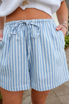 striped shorts women, summer drawstring shorts, coastal outfit shorts, blue white stripe shorts, casual summer bottoms