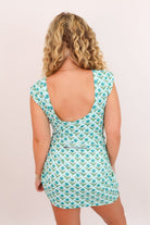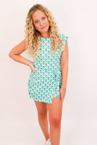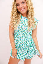 The sweetest combo of retro and sporty, this seafoam green skort romper brings all the fun! Featuring an all-over turquoise floral block print and a flattering wrap-style front with a side tie, this romper is giving coastal vintage vibes in the best way. The built-in shorts and soft stretch fabric make it easy to wear all day, while the scooped back and zip closure add just the right touch of flirty detail. Whether you’re headed to brunch, a round of pickleball, or a fun girls' night out, this one’s made to move with you!