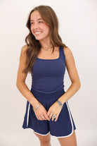 Say hello to your new go-to for sporty chic: the Varsity Pleated Athletic Romper. This one-piece wonder combines the ease of a romper with the style of a tennis skirt - the pleated side panels add movement and flair. Designed with a fitted tank-style top and a stretchy, high-rise waistband, it flatters in all the right places while keeping things comfy from tailgates to travel days.