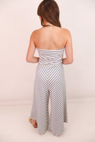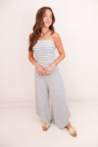blue and white romper, strapless wide leg romper, stripe jumpsuit, casual summer jumpsuit, summer jumpsuit, coastal romper outfit, textured knit romper, comfy strapless romper, travel-ready romper, beach vacation outfit
