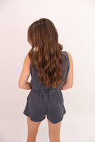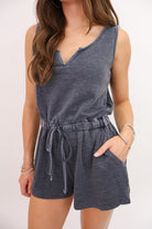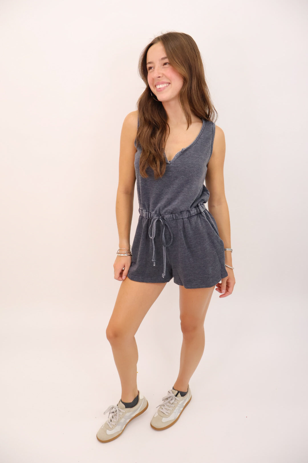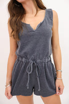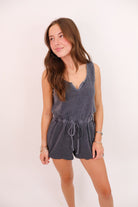 This romper was made for those "throw it on and go" kind of days. With a soft washed charcoal hue, notched neckline, and comfy drawstring waist, it's the one-piece wonder your wardrobe's been missing. From lounging at home to casual errands, this piece keeps it cute and chill!
