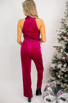 Step into the holiday celebrations in style with this hot pink velvet jumpsuit! Featuring a criss cross front neckline, straight leg, and fitted bodice, it’s the perfect statement piece for any occasion. Sparkle and shine this season!