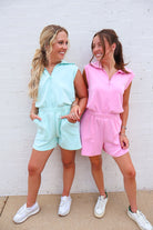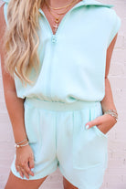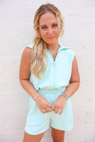 Your new everyday favorite just dropped. The Soft Modal Sleeveless Romper is that effortless, throw-on-and-go piece you’ll reach for again and again. Made from an ultra-soft modal blend, it feels like your favorite worn-in tee but looks polished enough for brunch with the girls or errands around town. Featuring a sleeveless zip-up front, a flattering cinched waist, and comfy elastic shorts with front and back pockets, it’s an easy win for style and comfort. This pretty ice mint hue adds a playful pop while still keeping things classic. Wear it solo with sneakers or layer it under a denim jacket—either way, you’re set for the day.