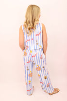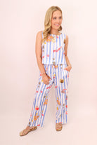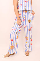 This fun and playful striped set is perfect for your next sunny getaway or casual outing! Featuring a vibrant mix of bold blue and white stripes with whimsical lobster, starfish, and pineapple prints, this set brings a fresh coastal vibe to your wardrobe. The relaxed, boxy crop top pairs effortlessly with the wide-leg pants, offering comfort and style in one easy look. The pants come with a tie waistband for a customizable fit, and pockets for practicality. Whether you're lounging by the pool, attending a beach party, or out for a casual brunch, this set offers a chic and effortless vibe!