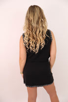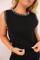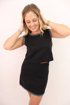 This black sweater set is proof that comfort can be chic! The sleeveless cropped top and matching mini skirt feature white stitch trim for a sporty-meets-sophisticated touch. Soft and stretchy, this set works just as well for gameday as it does for casual outings.