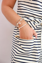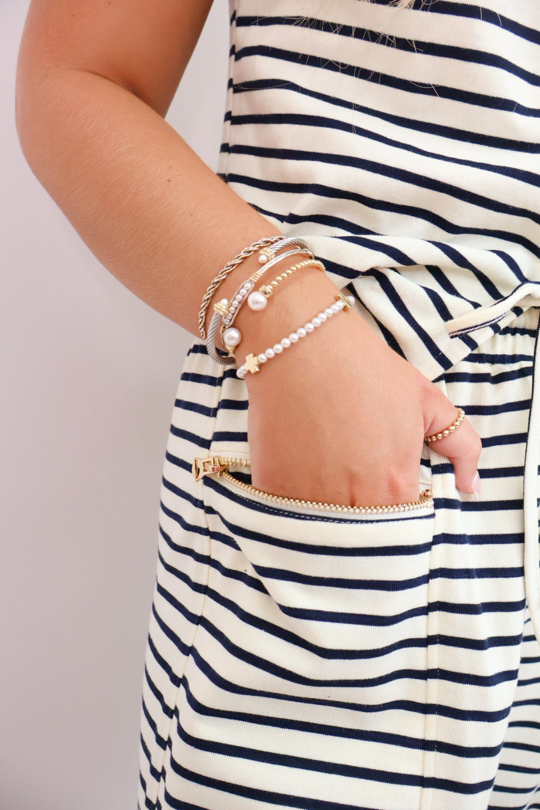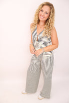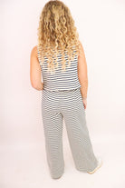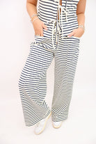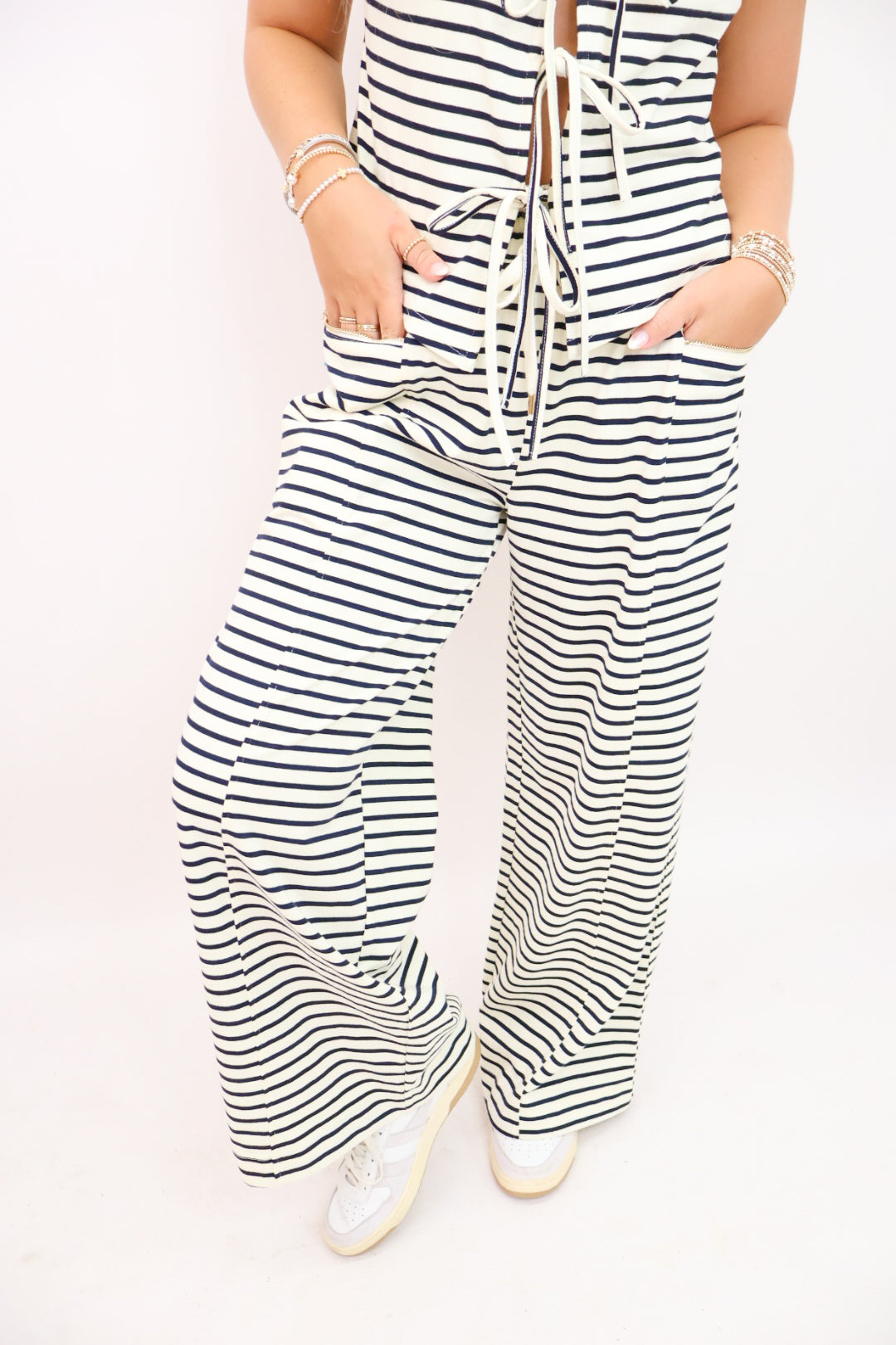 Say hello to effortless cool with a pre-fall twist! This striped pants set features a cream and navy stripe pattern with a deep-v tie-front sleeveless top and breezy wide-leg pants. The soft, stretchy ribbed fabric gives it a luxe feel while still being insanely comfy. The best part? Both the top and pants work just as well styled separately — but together, they're a total knockout!