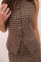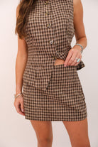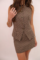 brown plaid two piece set, fall vest skirt set, plaid print matching outfit, plaid mini skirt set for women