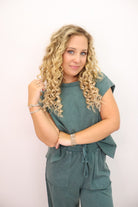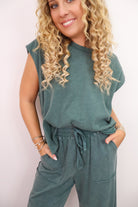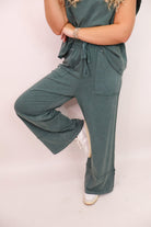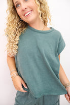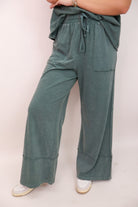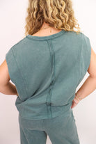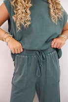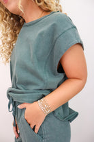 Laid-back, but never lazy—this washed green lounge set brings comfort and cool together in one look! The cap sleeve top has a muscle-tee shape we love, giving it that slightly edgy vibe, while the wide-leg pants keep it relaxed and easy. From school runs to Saturday lounging, you’ll be reaching for this one nonstop.