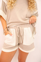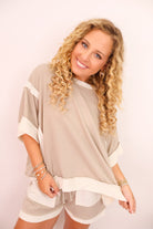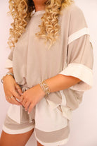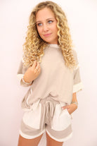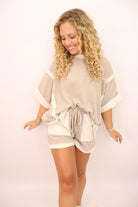 oatmeal knit short set, contrast trim lounge set, soft textured knit, neutral loungewear outfit, cozy matching fall set, elevated loungwear, causal top and shorts set