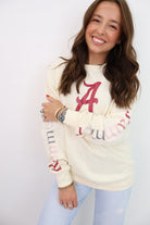Roll Tide! This Alabama Rammer Jammer long sleeve tee is the perfect addition to any Crimson Tide fan's wardrobe. The loose fit provides comfort while the Rammer Jammer design down each sleeve adds a touch of team spirit! Complete with a large script A on the front, this shirt is a must-have for any Alabama fan!