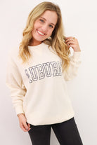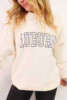 Stay cozy and stylish with this oatmeal waffle knit pullover, featuring a navy Auburn logo on the front. Oversized for ultimate comfort, it's the perfect addition to any wardrobe. Show off your love for Auburn University in style with this soft waffle knit top!