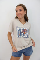 BEST SELLER! Gear up for gameday in our favorite v-neck tee! The soft wash and exclusive design make this tee an absolute must-have for cheering on the Auburn Tigers this season!