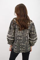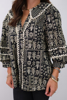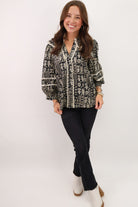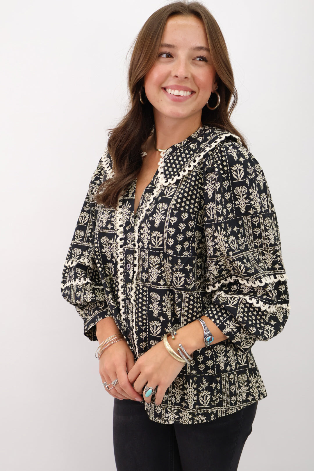 Elevate your fall wardrobe with our black floral top featuring a button front, peter pan collar, blousy sleeves, and delicate eyelet trim. Perfect for adding a touch of feminine charm to any outfit! A great top for any age and occasion - Embrace the elegance of our cream floral blouse today!