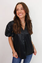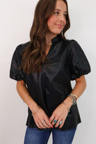 Elevate your fall wardrobe with our black leather top! Crafted from luxurious faux leather, this blouse features elegant puff sleeves and a flattering v neckline for a relaxed, yet sophisticated fit. Perfect for both casual and professional settings, pair with denim for a stylish look or dress up for work!