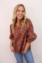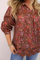Introducing our Brown Floral Babydoll Top! This stunning top features a mix of beautiful brown floral prints and charming rik rak ribbon details. Perfect for any occasion, pair it with your favorite denim for a stylish and effortless look. Elevate your wardrobe with this must-have fall top!