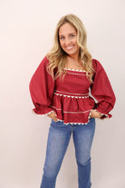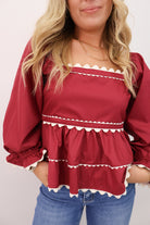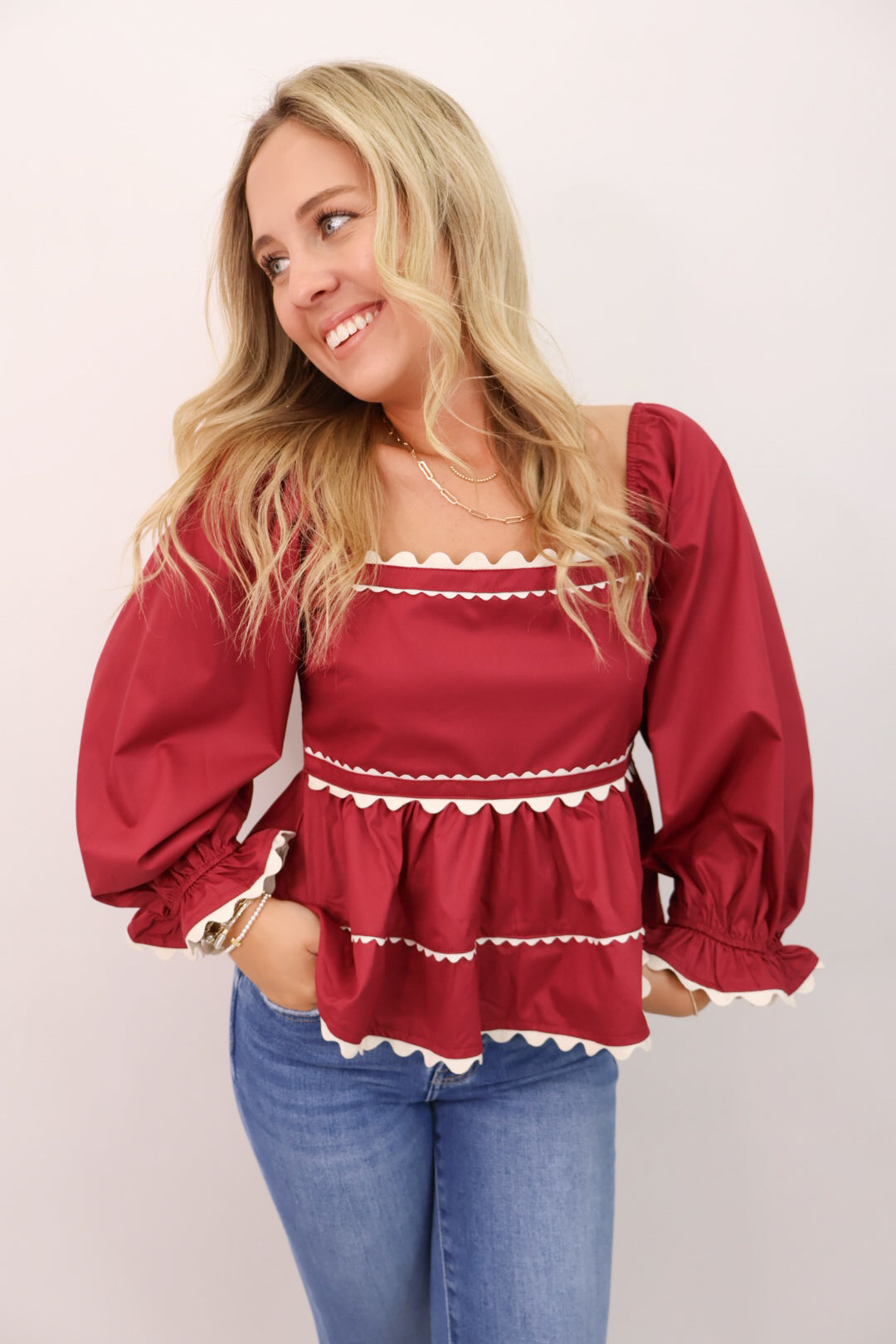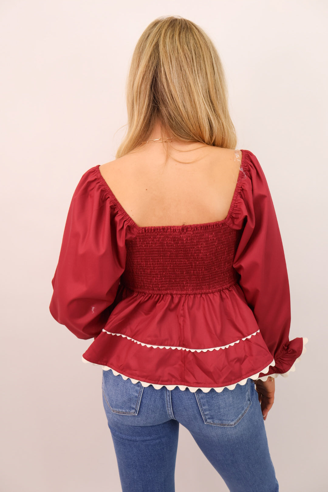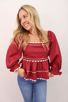 Indulge in luxury with our Crimson top, adorned with delicate ecru trim details! The square neckline and long puff sleeves add a touch of elegance, while the peplum hem adds a flattering silhouette. Elevate any outfit with this crimson top and feel effortlessly chic!