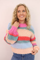 Elevate your wardrobe with our Bright Pastel Striped Sweater. Featuring bright pastel colors and a chunky knit, this semi-cropped sweater pairs perfectly with denim for a trendy and cozy look. Add a pop of color to your outfit and stay warm in style!