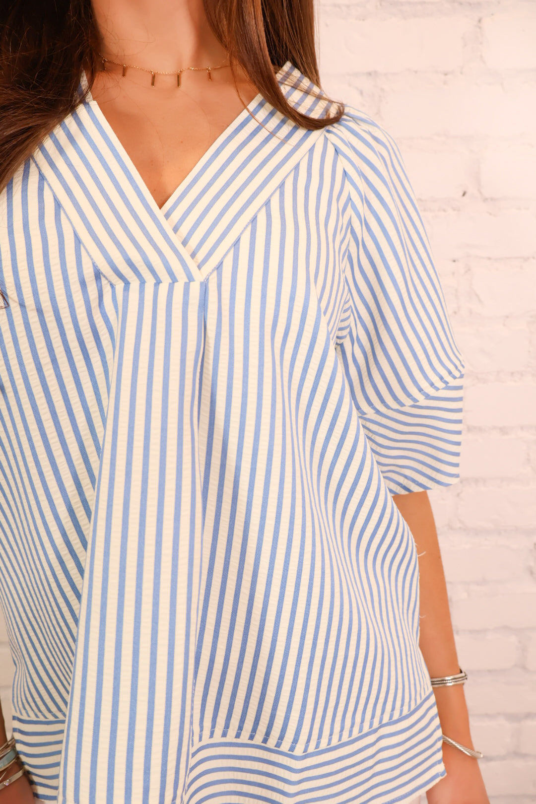 Classic, comfortable, and endlessly versatile, the Relaxed Striped V-Neck Top is a timeless piece you'll wear all season long! Featuring a soft blue and cream stripe pattern, this top brings a fresh coastal-inspired feel to your wardrobe.