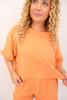 This set brings all the sunshine energy—even when you're just sipping coffee at home. With an oversized short sleeve top and matching elastic waist shorts, it’s cute without trying too hard. Available in a dreamy soft orange and a neutral cream, both featuring subtle ribbed texture and raw edge detailing.