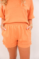 terry shorts set, orange lounge set, cream shorts set, cozy fall loungewear, comfy ribbed two-piece outfit, casual shorts set, elevated loungewear