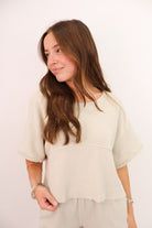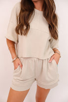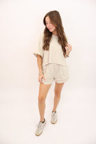 This set brings all the sunshine energy—even when you're just sipping coffee at home. With an oversized short sleeve top and matching elastic waist shorts, it’s cute without trying too hard. Available in a dreamy soft orange and a neutral cream, both featuring subtle ribbed texture and raw edge detailing.