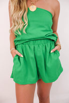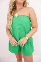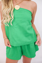 Say hello to your new sunny day go-to. The Capri Strapless Set is bold, breezy, and made for fun—whether you're beach-bound or brunching. This two-piece set features a strapless bandeau-style top with a flowy fit and an open back with an adjustable self-tie bow for a flirty touch. The matching high-waisted shorts have an elastic waistband and a relaxed silhouette that keeps things comfy and cute. Available in three vibrant shades—green, turquoise, and pink—this look is giving vacation energy, even if you're just headed to your backyard.