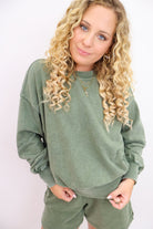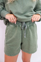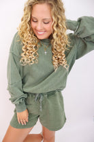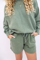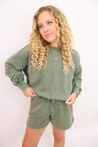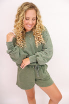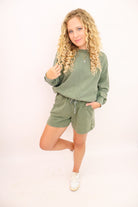 Meet your new favorite neutral. The Cozy Club Lounge Set in Olive is fall-ready and effortlessly laid-back, thanks to its mineral-washed finish and slouchy silhouette. This set includes a relaxed-fit sweatshirt with subtle drop shoulders and a pair of matching drawstring shorts with a comfy elastic waistband - made for slow mornings, weekend errands, or travel days. The fabric is soft and substantial without feeling too heavy — perfect for transitioning into the cooler months.