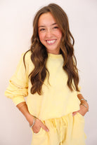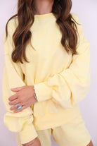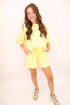 butter yellow lounge set, cozy fall outfit, fleece pullover and shorts, weekend lounge set, comfy travel outfit, relaxed sweatshirt set, boutique loungewear, casual butter yellow set