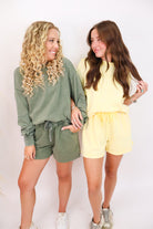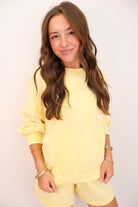 This buttery-soft set is sunshine in outfit form! The Cozy Club Lounge Set in Butter Yellow features a relaxed pullover sweatshirt and matching drawstring shorts that were made for slow mornings, weekend errands, or travel days. The vintage-washed finish gives it that perfectly worn-in look and feels like a dream. Whether you wear the pieces together or mix and match, this is one set you’ll live in. Perfect weight to transition into fall!