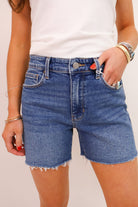 Meet your new go-to denim mom shorts—a perfect blend of comfort, style, and effortless cool. Designed with a flattering high-rise fit, these shorts accentuate the waist for a smooth, tailored silhouette while offering a longer length for extra coverage. The relaxed fit and raw hem makes them ideal for everything from casual weekend outings to summer adventures. Pair them with a breezy blouse or an easy tee for a laid-back, chic look.