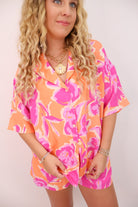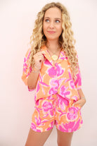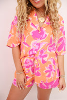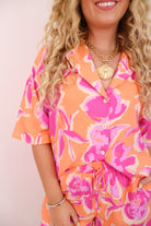 floral two piece set, tropical summer outfit, vacation matching set, orange and pink floral outfit, button down and shorts set, beach resort co-ord, bold printed lounge set, lightweight summer set, vacation-ready two piece, The Destination Edit