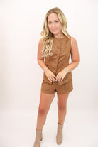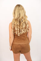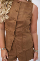 camel suede set, sleeveless vest shorts set, tailored suede shorts outfit, fall matching set, faux suede two piece set, suede vest and shorts set, country concert outfit inspo