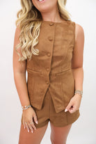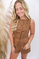 Elevated, chic, and effortlessly cool — this camel faux suede shorts set is your shortcut to instant polish this fall! The sleeveless vest-style top features a tailored fit and covered buttons for a sleek look, while the matching high-waist shorts give you that put-together feel without sacrificing comfort. Perfect for fall layering, it’s the kind of set that can go from the office with a blazer to a night out with boots in seconds.