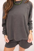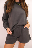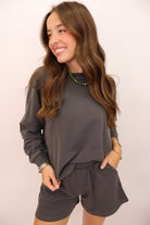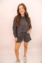 An instant cozy win! This washed charcoal-colored short set is perfect for those days you want to look put-together without even trying. The ribbed cuffs on the sweatshirt and the flattering fit of the shorts make it easy to toss on and go. You’ll live in this all season long!
