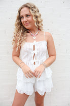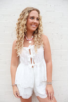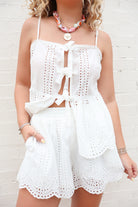 Step into your European Summer era with this dreamy white eyelet set! With scalloped hems, delicate eyelet embroidery, and sweet front-tie details, this set is made for golden hour strolls through seaside villages—or any summer plans ahead. The tiered top gives off flirty vacation vibes while the matching shorts keep things breezy and comfy. Whether you're pairing it with slides for an easy daytime look or adding statement earrings for a rooftop dinner, this set is a suitcase (and summer closet) essential.