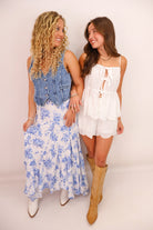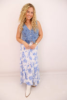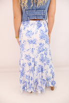 Float through the season in our Blue Belle Floral Maxi Skirt! With its soft ivory base and dainty blue vintage-inspired print, this skirt brings instant charm. The paneled design gives it the perfect drape and flow. Whether you're pairing it with a denim vest or a white tank, this is one of those pieces that always gets compliments.