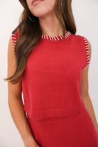 Contrast Stitch Sweater Top and Skirt Set - Crimson