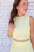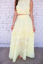 butter yellow eyelet set, two piece summer outfit, matching eyelet crop top and skirt, high neck summer top, yellow maxi skirt set, feminine two piece look, embroidered set for summer, vacation outfit idea
