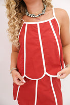 Bold, playful, and game day ready—this crimson scallop set was made for standing out in the crowd. The two-piece design features a swingy halter-style tank and coordinating mini skirt, both trimmed in bright white piping for a crisp, clean contrast. We’re obsessed with the unique scalloped hem that gives it that flirty, elevated edge. Whether you’re heading to the tailgate, a themed party, or brunch with the girls, this set will have you looking effortlessly put together with minimal effort.