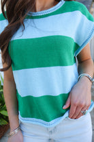 The bold green and soft blue stripe combination gives it a fresh, coastal feel that works beautifully for spring and summer. The wide stripes make a statement while the soft knit keeps it comfortable and easy to style.